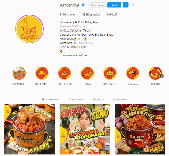 Halaman IG Eatsambel juga menampilkan banyak tautan yang akan menghubungkan pembeli ke beragam halaman penting, termasuk ke websitenya.