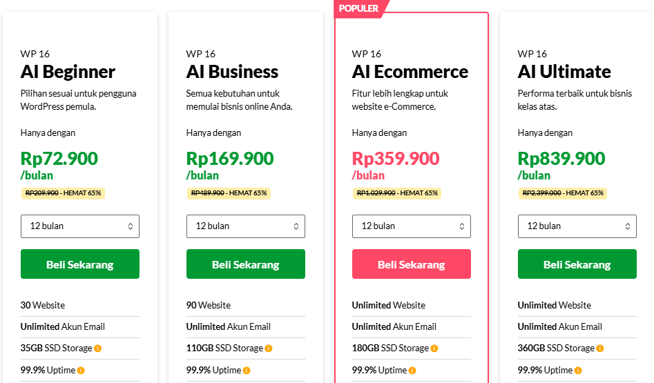 • AI Beginner : Paket ini memiliki CPU 1 Core, Memori 1 GB, Disk Space sebanyak 35 GB dan bisa digunakan untuk 30 website. Anda bisa mendapatkan hosting ini dengan harga Rp 72.900/bulan untuk pembelian 1 tahun. Paket ini sangat cocok untuk pengguna WordPress pemula.