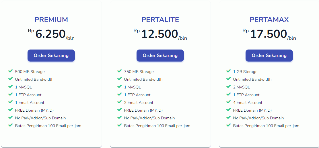 • Pertamax : Memiliki 1000 MB Storage, Unlimited Bandwith. Anda bisa mendapatkan paket ini dengan harga Rp 17,500/bulan.
