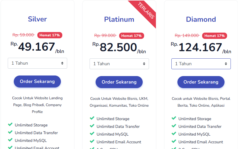 • Platinum : Memiliki Strorage dan Data Transfer Unlimited, 1 Core CPU, 1.5 GB Ram. Paket ini Cocok digunakan untuk Website Bisnis, UKM, Organisasi, Komunitas, dan Toko Online. Anda bisa mendapatkannya dengan harga Rp 82.500/bulan.