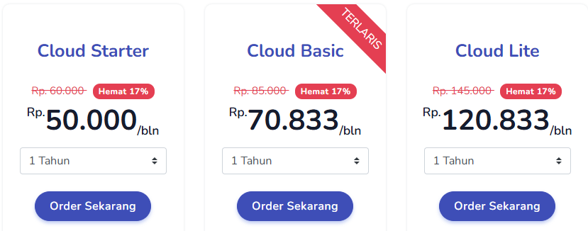 • Cloud Starter : Paket ini memiliki 3 GB Storage, Unlimited Data Transfer, 1 Core CPU, dan 1024 MB RAM. Anda bisa mendapatkan paket ini dengan harga Rp 50.000/bulan.