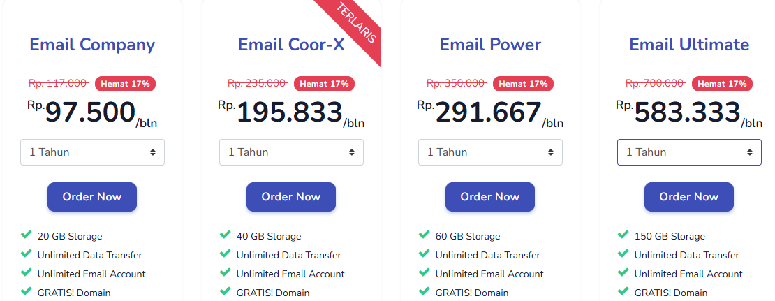 • Email Ultimate : Memiliki 150 GB Storage, Unlimited Data Transfer dan 350 Email / Jam. Anda bisa mendapatkan paket ini dengan harga 583.333/bulan.