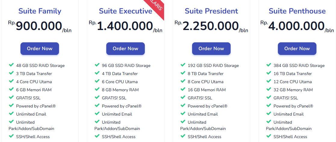 • Suite President : Memiliki 192 GB SSD RAID Storage, 8 TB Data Transfer, 8 Core CPU Utama, dan 16 GB Memori RAM. Anda bisa mendapatkan paket hosting ini dengan harga Rp 2.250.000/bulan.