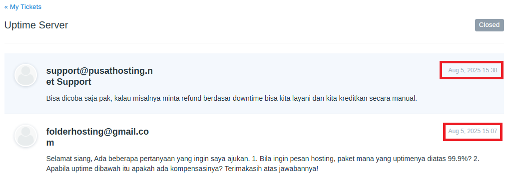 Perkembangan ini menunjukkan bahwa Pusathosting mulai memperhatikan peningkatan kualitas layanan, meskipun masih terdapat ruang yang cukup besar untuk perbaikan agar waktu tanggapan menjadi lebih optimal.